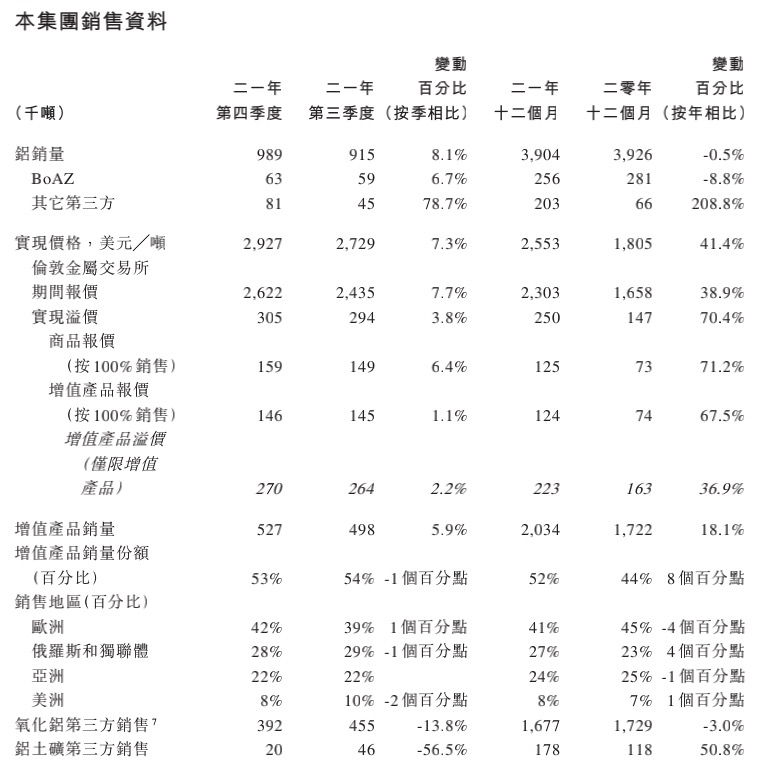 2月9日,俄铝公布的2021年经营数据显示:2021年,铝产量与去年相若,共376.4万吨(同比上升0.2%);铝销售量同比下降0.5%至总计390.4万吨。其中,欧洲销售份额下降至41%(2020年度为45%),俄罗斯和独联体地区份额则上升至27%(2020年度为23%),美国份额上升至8%(2020年度为7%);亚洲则为24%(2020年度为25%)。