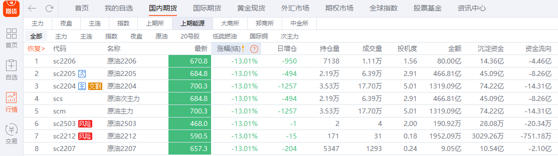 (上期原油跌停合约行情;来源:东方财富期货PC端)