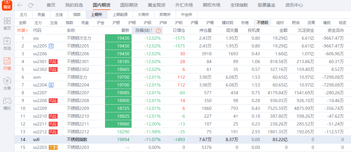 昨日夜盘,正常交易的沪镍NI2208、NI2210、NI2211合约开盘后迅速跌停,NI2203、NI2302合约也大幅下挫。记者注意到,镍下游的不锈钢也紧随其后,多数合约在夜盘开盘半小时后跌停,跌幅达12%。不锈钢价格基本回到此番上涨之前的位置。