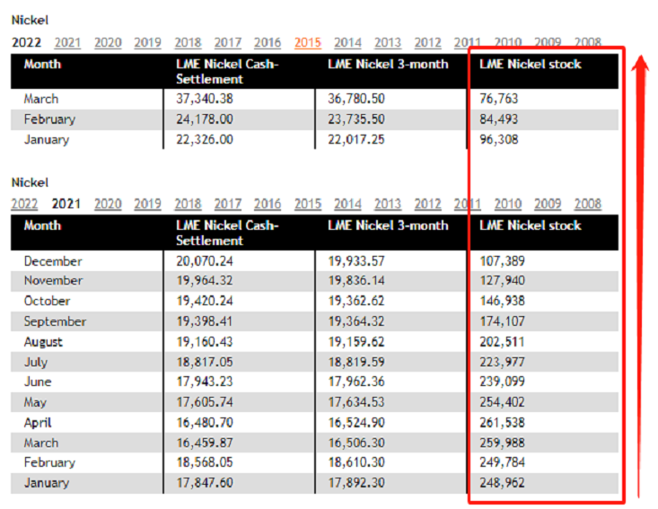 今年2月有外媒报道称,LME数据显示,有一名身份不详的镍库存持货商,持有至少LME一半的库存(截至2022年2月9日)。