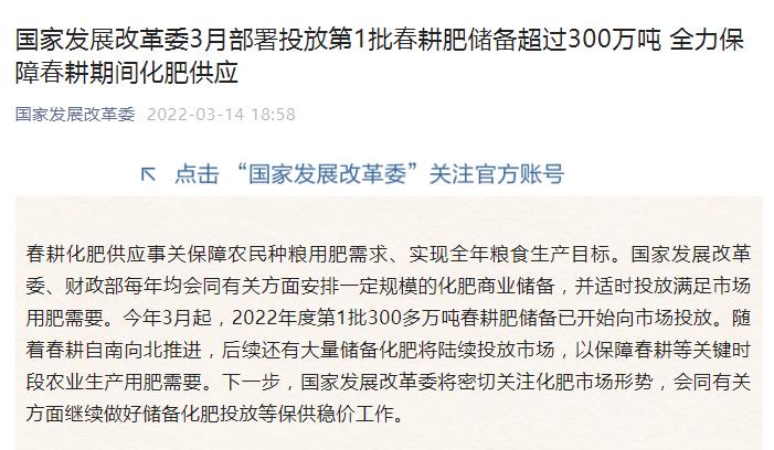 春耕化肥供应事关保障农民种粮用肥需求、实现全年粮食生产目标。国家发展改革委、财政部每年均会同有关方面安排一定规模的化肥商业储备,并适时投放满足市场用肥需要。今年3月起,2022年度第1批300多万吨春耕肥储备已开始向市场投放。随着春耕自南向北推进,后续还有大量储备化肥将陆续投放市场,以保障春耕等关键时段农业生产用肥需要。下一步,国家发展改革委将密切关注化肥市场形势,会同有关方面继续做好储备化肥投放等保供稳价工作。