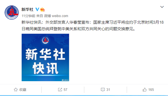 外交部发言人华春莹宣布:国家主席习近平将应约于北京时间3月18日晚同美国总统拜登就中美关系和双方共同关心的问题交换意见。