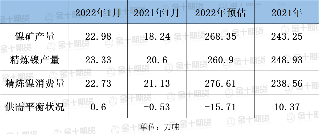 国际镍业研究组织(INSG)公布的数据显示,2022年1月全球镍市场供应过剩6000吨,去年同期为短缺5300吨。预计今年全球镍市场将出现15.71万吨的供应短缺,而2021年为供应过剩10.37万吨。