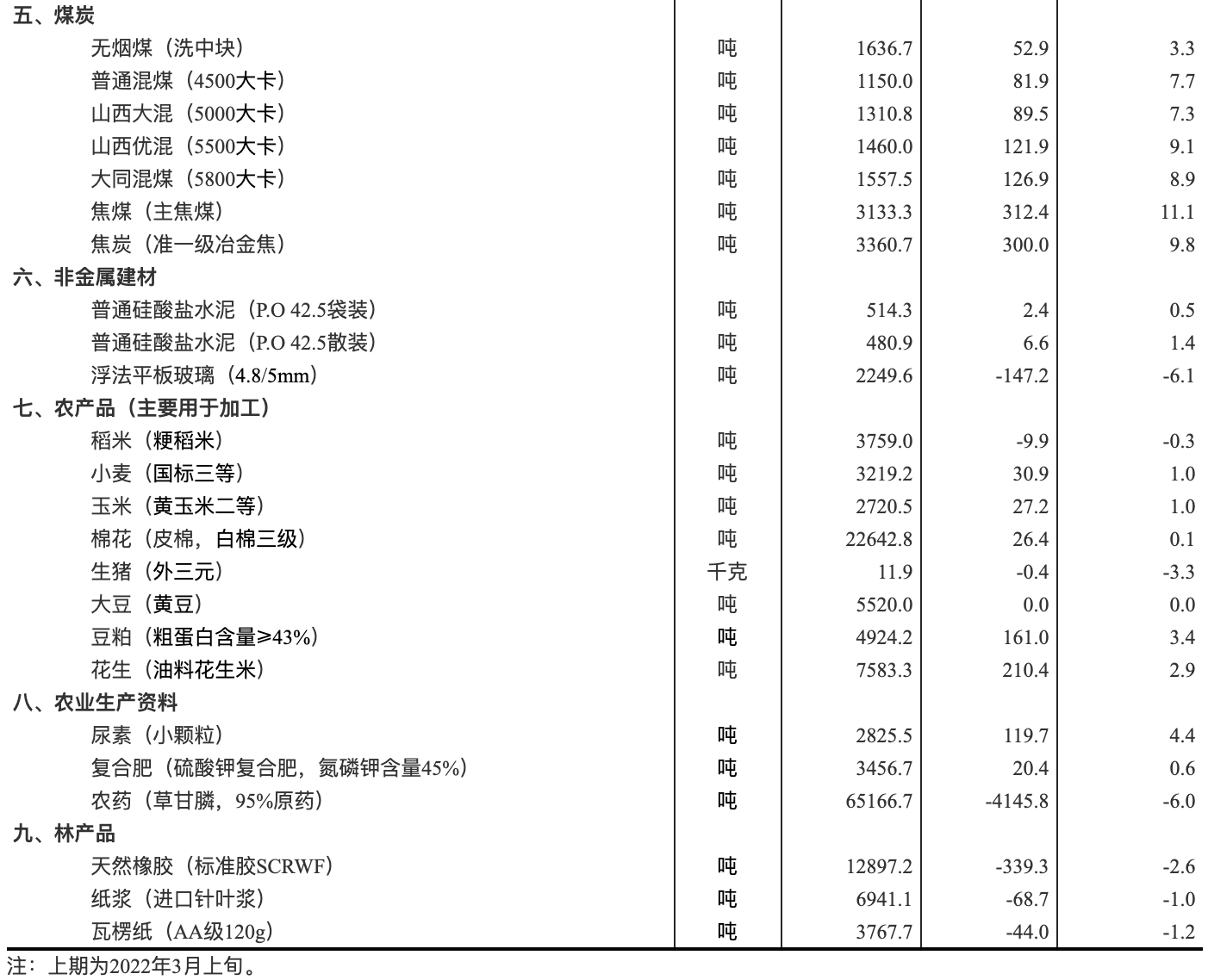 2022年3月中旬流通领域重要生产资料市场价格变动情