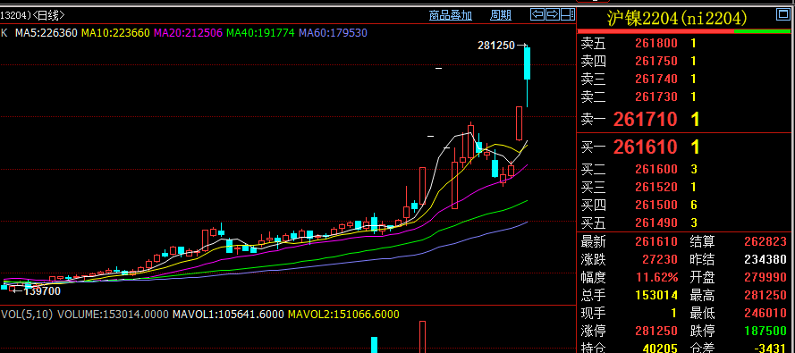 沪镍期货合约也在连续3个涨停板后暂时交易1天,NI2204合约最高涨至267700元每吨。