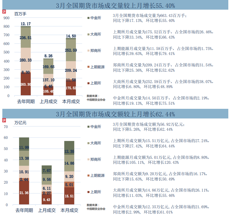 4月1日,中国期货业协会发布3月全国期货市场交易情况简报。数据显示,3月全国期货市场成交量6.63亿手,成交额为56.92万亿元,环比分别增长55.40%和62.44%。
