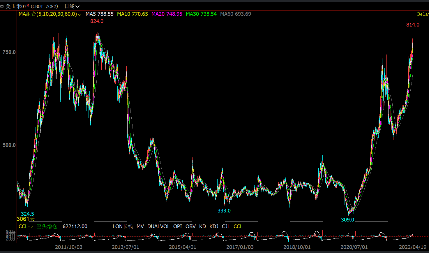 截至4月19日,美国CBOT 7月玉米期货突破8美元/蒲式耳,逼近2012年9月达到的每蒲式耳8.49美元的历史高位。今年以来,美国玉米期货价格由年初的6美元/蒲式耳,上涨超过30%。