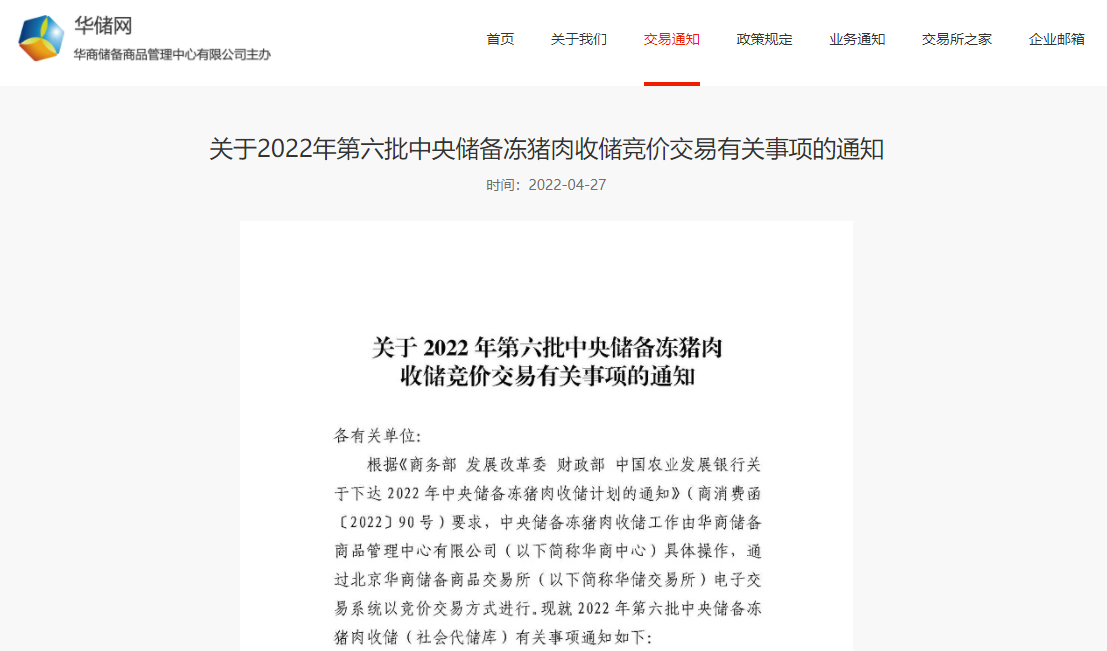 4月27日,华储网发布通知,将于4月29日执行第六批中央储备冻猪肉收储竞价交易,本次收储挂牌竞价交易4万吨。2022年,中央储备冻猪肉收储批次格外密集,尤其是4月份,即将成为本月第四个批次。