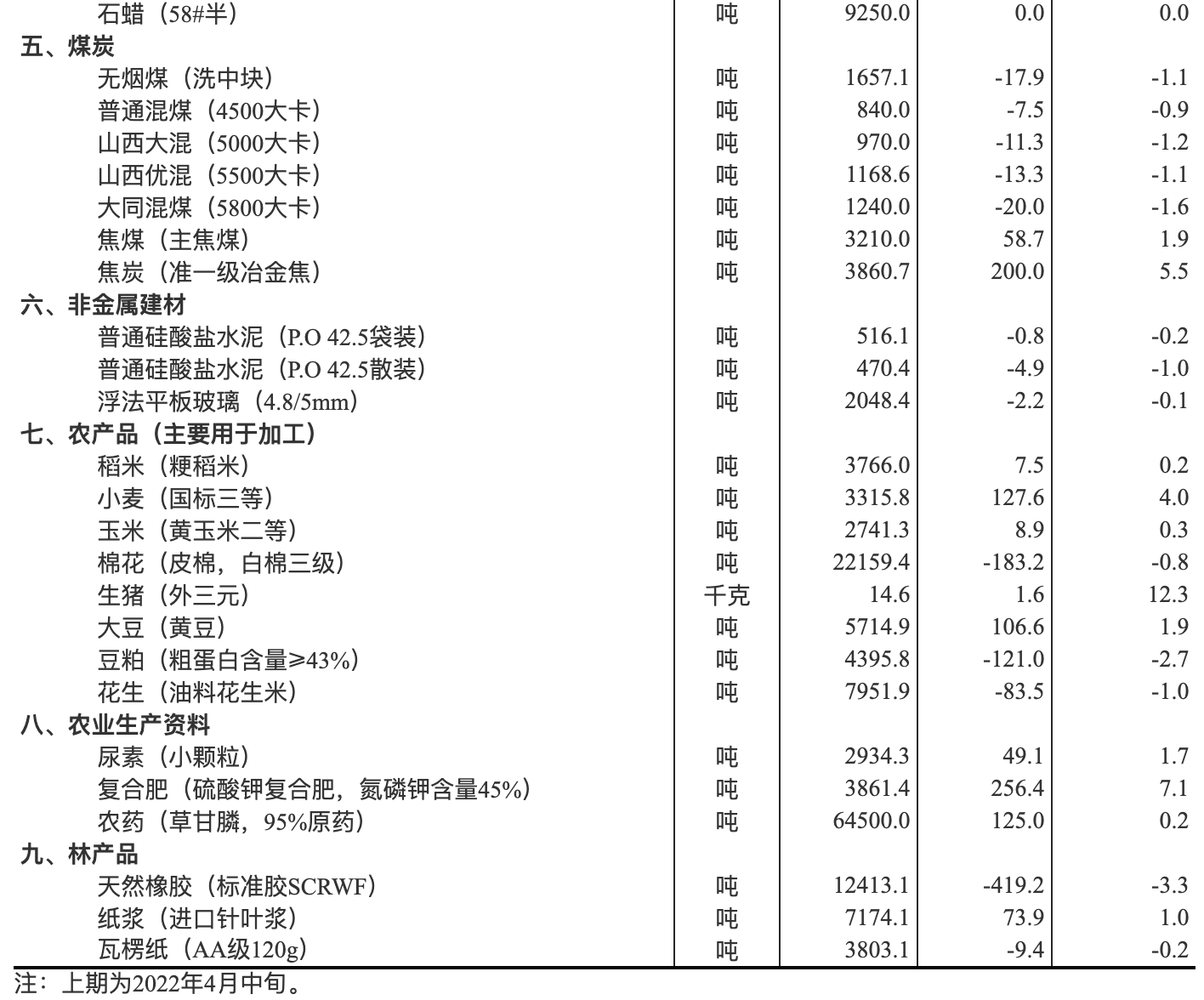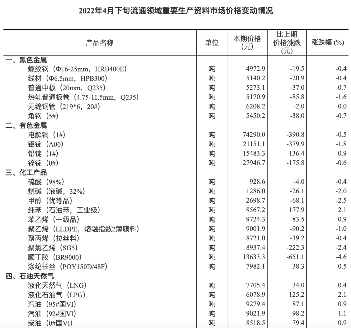统计局发布数据,据对全国流通领域9大类50种重要生产资料市场价格的监测显示,2022年4月下旬与4月中旬相比,20种产品价格上涨,28种下降,2种持平。生猪(外三元)本期价格14.6元/千克,环比上涨12.3%,复合肥(硫酸钾复合肥,氮磷钾含量45%)本期价格3861.4元/吨,环比上涨7.1%。