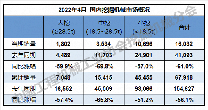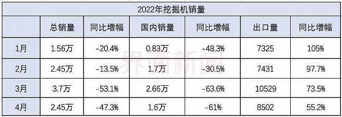 综合看,1-4月,26家主机制造企业共计销售各类挖掘机械产品10.2万台,同比下降41.4%。其中,国内市场销量6.8万台,同比下降56.1%;出口销量3.4万台,同比增长78.9%。