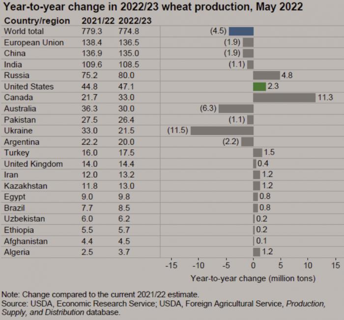 另据美国农业部5月16日发布的月度小麦展望报告,2022/23年度全球小麦总产量预计下降0.6%至7.748亿吨。具体来看,加拿大和俄罗斯预计将从2021/22年度的产量下降中反弹,而乌克兰和澳大利亚预计将低于2021/22年度的产量纪录。美国也预计会从去年干旱导致的春小麦减产中反弹,但预计今年冬小麦减产率会更高,这可能限制美国小麦产量的扩大。