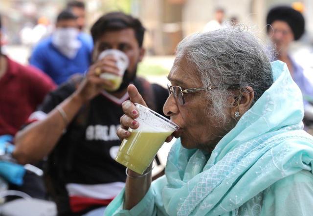 4月29日,在印度阿姆利则,人们喝冷饮消暑 图片来源:新华社