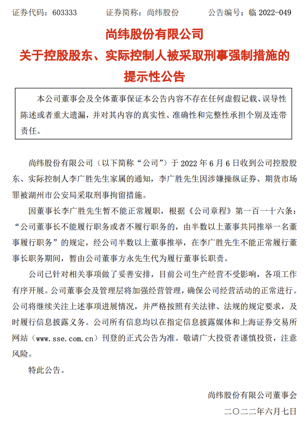 尚纬股份6月6日晚间公告,公司于2022年6月6日收到公司控股股东、实际控制人李广胜家属的通知,李广胜因涉嫌操纵证券、期货市场罪被湖州市公安局采取刑事拘留措施。因董事长李广胜暂不能正常履职,根据规定,经公司半数以上董事推举,在李广胜不能正常履行董事长职务期间,暂由公司董事方永代为履行董事长职责。公司已针对相关事项做了妥善安排,目前公司生产经营不受影响,各项工作有序开展。