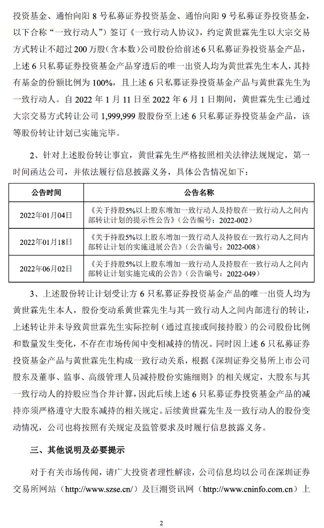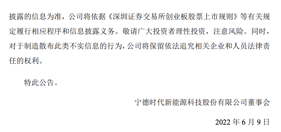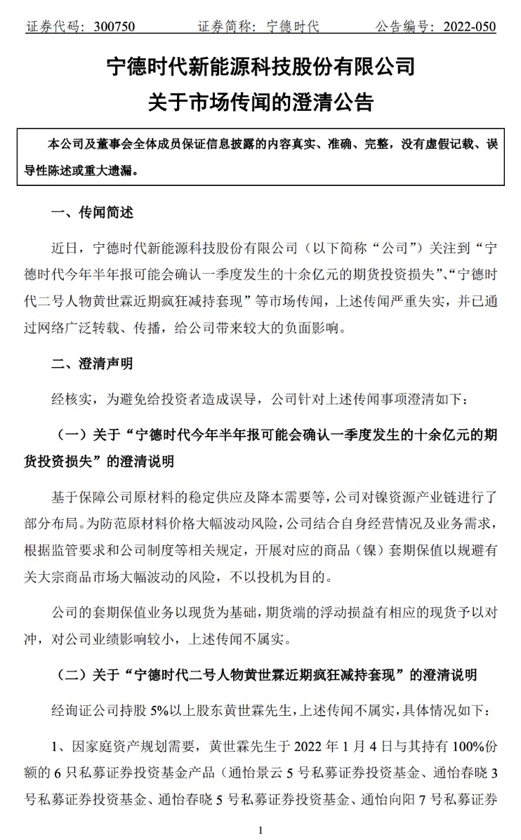 宁德时代(300750)6月9日晚间公告,近日,公司关注到“宁德时代今年半年报可能会确认一季度发生的十余亿元的期货投资损失”、“宁德时代二号人物黄世霖近期疯狂减持套现”等市场传闻,上述传闻严重失实,并已通过网络广泛转载、传播,给公司带来较大的负面影响。公司的套期保值业务以现货为基础,期货端的浮动损益有相应的现货予以对冲,对公司业绩影响较小,上述传闻不属实。因家庭资产规划需要,黄世霖于1月4日与其持有100%份额的6只私募证券投资基金产品签订一致行动人协议,约定黄世霖转让不超过200万股公司股份给前述6只私募证券投资基金产品,该等股份转让计划已实施完毕。上述转让并未导致黄世霖实际控制(通过直接或间接持股)的公司股份比例和数量发生变化,不存在市场传闻中变相减持的情况。