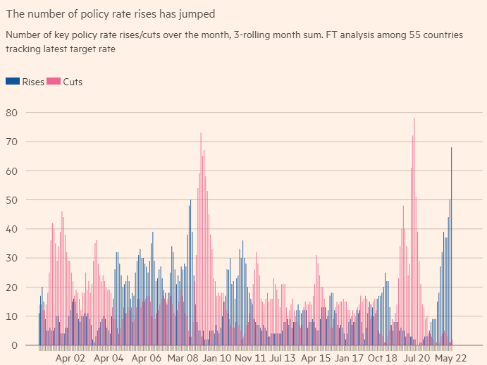 今年以来,加息的全球央行数量飙升图片来源:《金融时报》