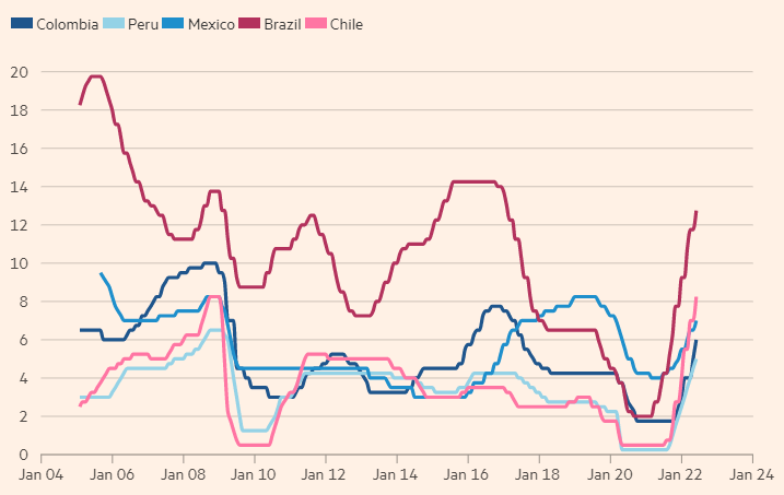 中美洲和拉丁美洲多家央行去年开始加息图片来源:《金融时报》