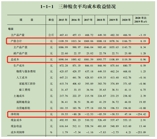 而由国家发展和改革委员会价格司、价格成本调查中心编制的《全国农产品成本收益资料汇编(2021)》显示,从“三种粮食平均”成本收益情况来看,2020年,产值合计1166.73元,总成本1119.59元,净利润47.14元。据该汇编材料编者说明,“三种粮食平均”指稻谷、小麦、玉米平均。