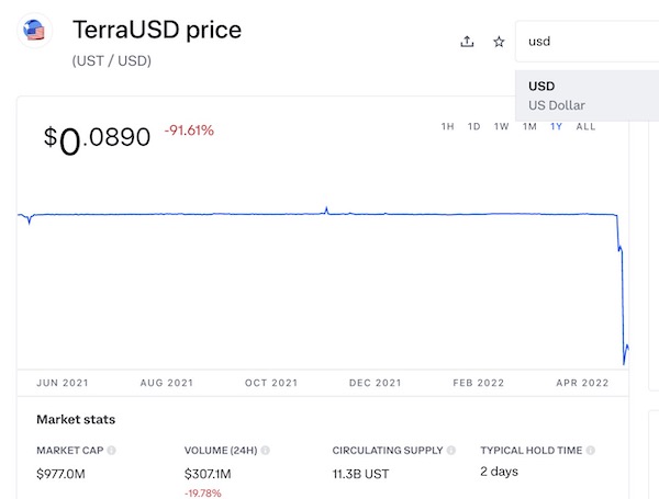 当时,UST及LUNA遭遇“死亡踩踏”,UST本应锚定在1美元,但却暴跌至26美分,此后一周只剩下可怜的不到0.09美分。在LUNA币值一度蒸发99%之后,第一大稳定币“担保稳定币”USDT跌破本应锚定的1美元,一度跌至95美分,当时比特币价格也被推低至16个月新低。