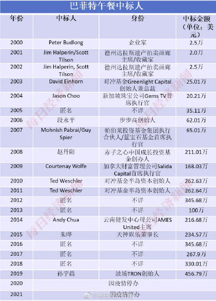 同年,第一届巴菲特午餐正式在线下开拍,起拍价为2.5万美元。一位互联网公司的电气工程师Pete Budlong以底价中拍。 第三年的中拍者是David Einhorn.那年,巴菲特午餐从线下转到线上的eBay,中标价一下从2.5万美元左右跃升至25万美元。