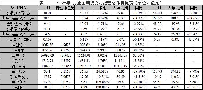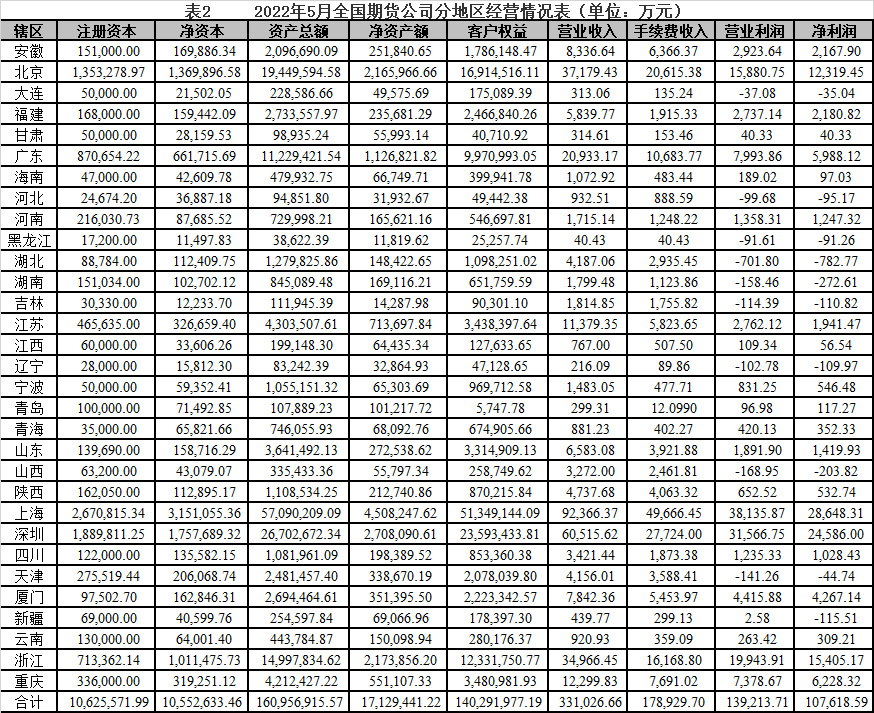 截至2022年5月末,全国共有150家期货公司,分布在31个辖区。2022年5月交易额40.01万亿元,交易量4.71亿手,营业收入33.10亿元,净利润10.76亿元。