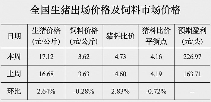 发改委价格监测中心网站27日公布2022年6月第4周猪料、鸡料、蛋料比价:截至2022年6月22日当周,全国猪料比价为4.73,环比涨幅2.83%。按目前价格及成本推算,未来生猪养殖头均盈利为226.97元。国内猪价以涨为主。随着各地管控力度减弱,终端市场需求稍有回暖,周初屠企开工率温和回升,养殖单位看涨情绪转浓,带动北方猪价强势上涨,并传导至南方联动上涨。但由于南方猪源相对充裕,故猪价涨速明显慢于北方。下周来看,业内看涨情绪不减,预计短期猪价或震荡缓涨。