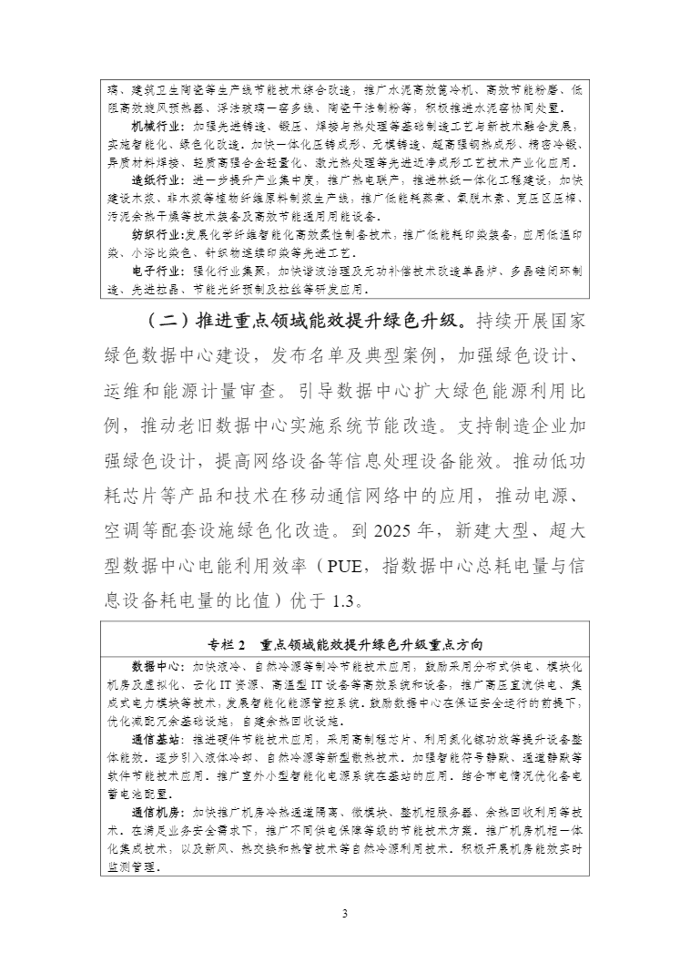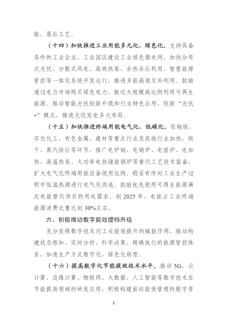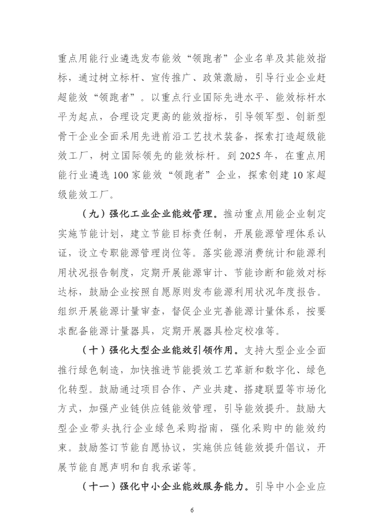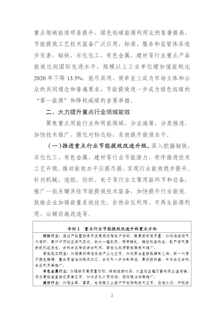 工信部等六部门印发工业能效提升行动计划。其中提出,到2025年,重点工业行业能效全面提升,数据中心等重点领域能效明显提升,绿色低碳能源利用比例显著提高,节能提效工艺技术装备广泛应用,标准、服务和监管体系逐步完善,钢铁、石化化工、有色金属、建材等行业重点产品能效达到国际先进水平,规模以上工业单位增加值能耗比2020年下降13.5%。能尽其用、效率至上成为市场主体和公众的共同理念和普遍要求,节能提效进一步成为绿色低碳的“第一能源”和降耗减碳的首要举措。