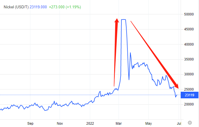 “妖镍”史诗级逼空大战后,由于对全球经济衰退的担忧,镍价一路走低,青山控股按照此前的回应逐渐减持了空头头寸。彭博社援引知情人士称,目前青山控股仍持有LME镍空头头寸,但已缩减至3万吨左右,远低于此前超15万吨的峰值,且均未通过摩根大通持有。
