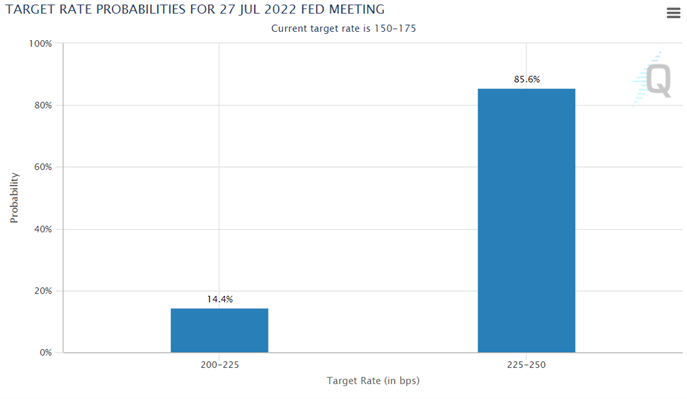 对于北京时间7月28日美联储公开市场委员会(FOMC)将决定的加息幅度,市场普遍预期加息75个基点。据芝商所的“美联储观察”工具,目前市场预计美联储在7月份加息75个基点的概率达85.6%,加息50个基点的概率为则14.4%。