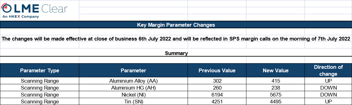 伦敦金属交易所(LME)公告,下调伦铝保证金至238美元,下调伦镍保证金至5675美元,上调伦锡保证金至4495美元,于2022年7月6日收盘后生效。