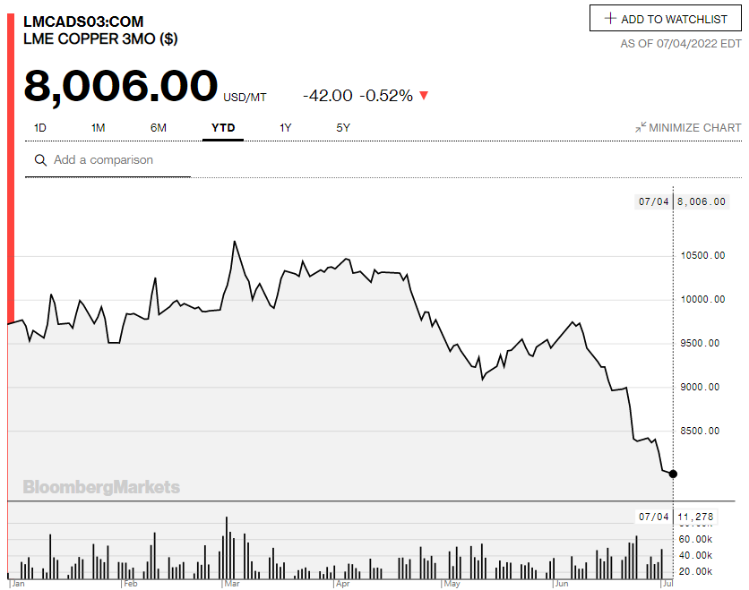 数据显示,美国天然气上个月暴跌逾32%,美油上月累跌7.6%,小麦、玉米和大豆的价格都回落至3月底的水平,自5月初以来棉花价格跌幅超过三分之一;LME期铜价格上周刚刚跌破了8000美元/吨关口,为2021年初以来首次;整个二季度,在伦敦交易的一篮子工业金属录得2008年全球金融危机以来最差单季表现。随着关于全球经济衰退的警告声甚嚣尘上,几乎所有工业金属眼下都面临承压。