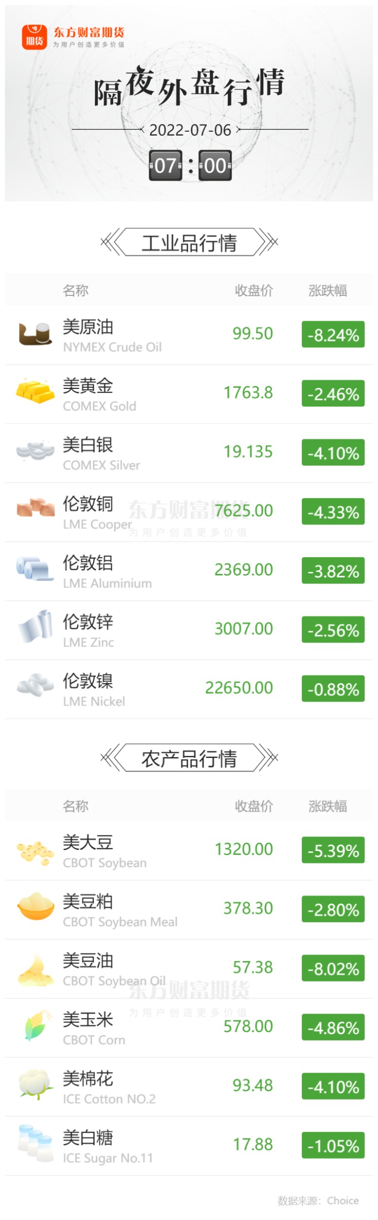 国际原油期货价格大幅下跌,WTI 8月原油期货收跌8.93美元,跌幅8.24%,报99.50美元/桶,这是近两个月来美国原油期货价格首次跌破每桶100美元;布伦特9月原油期货收跌8.86美元,跌幅7.94%,报102.77美元/桶,两者均创3月中旬以来单日最大跌幅。