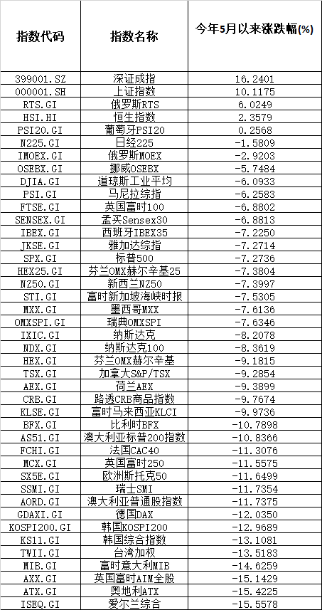 今年5月以来全球42个主要指数涨跌幅(数据来源:Choice数据)