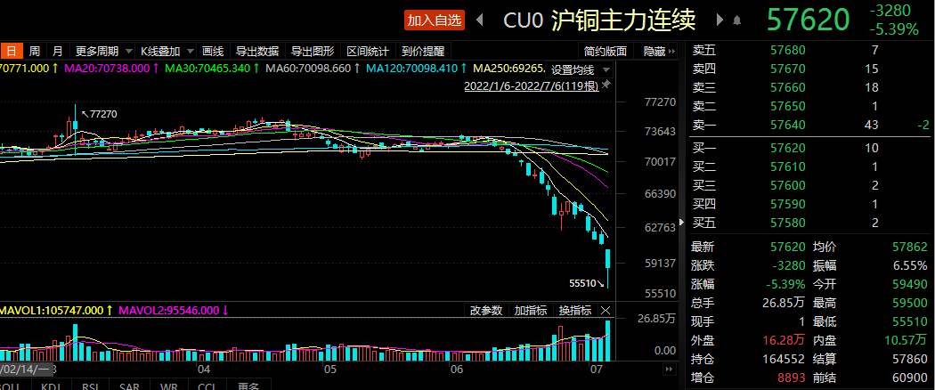 近期,有色金属是大宗商品中下跌较多的一个品类,沪锡在今年3月见到历史高点之后,便开启了一轮持续至今的的大幅回调,最近4个月时间内沪锡价格的最大跌幅高达54%。而历来对宏观经济冷暖的变化较为敏感“铜博士”,近期亦出现了一波快速下跌,这在近期的大宗商品中具有一定的代表性。今日,沪铜价格最低跌至55510元/吨,主力合约跌幅超过7%,价格创年内新低。据统计,自年初以来,铜价已下跌接近20%。