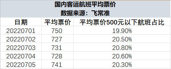 飞常准向界面新闻提供的数据显示,7月1日至7月5日,国内客运航班平均票价在727元-750元之间。其中,平均票价500元以下的航班量占比在20%左右(不含燃油机建费)。这意味着,近期约有1/5的国内航班,机建燃油费接近票价,或占乘客支付总价的一半以上。