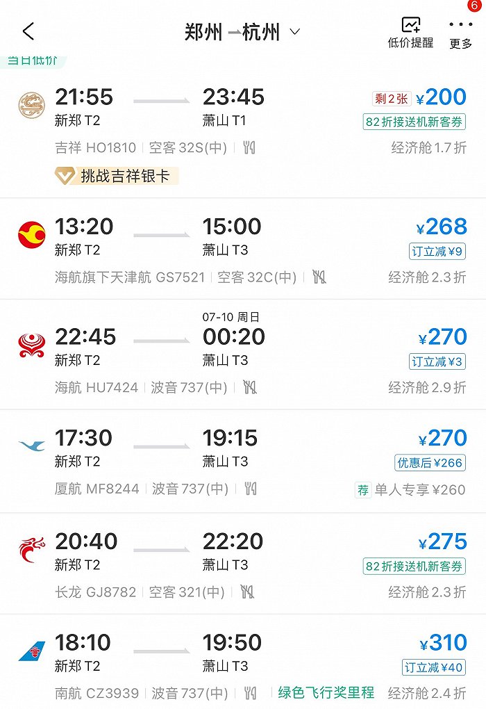 以7月9日郑州-杭州为例,界面新闻记者搜索携程app发现,当天20趟航班中约有9趟票价在200元-350元之间,最高的一趟航班票价也不超过700元,而机建加燃油费就需要250元。