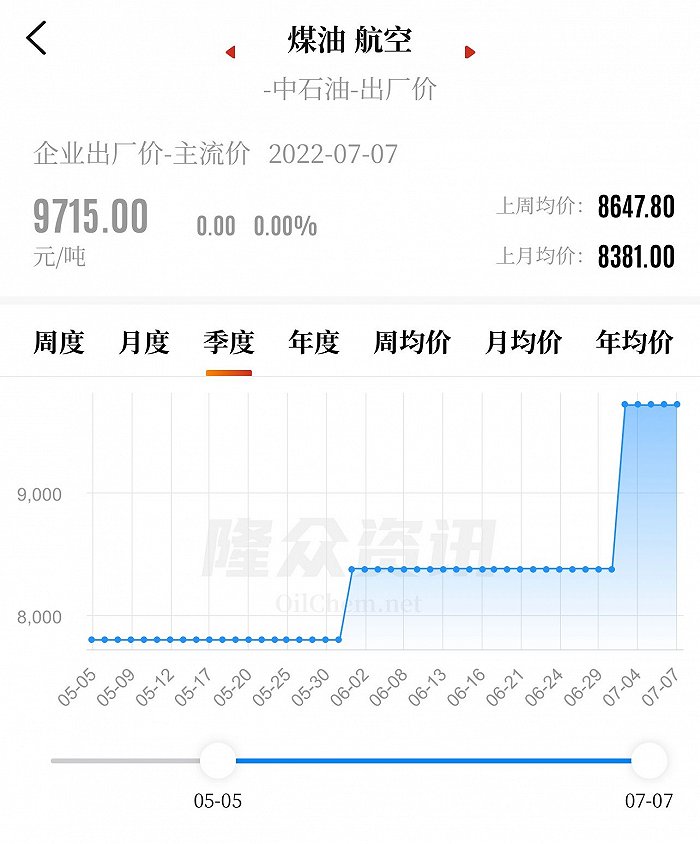 能源化工市场价格指数供应商隆众资讯数据显示,中石油自2022年7月1日零时起,上调6月份航空煤油结算价格,涨幅为1334元/吨;各炼化分公司供中航油及由中航油进行资源配置的各油料单位航空煤油(标准品)交销售分公司的含税出厂价格为9715元/吨(进口到岸完税价格基础上减60元/吨)。