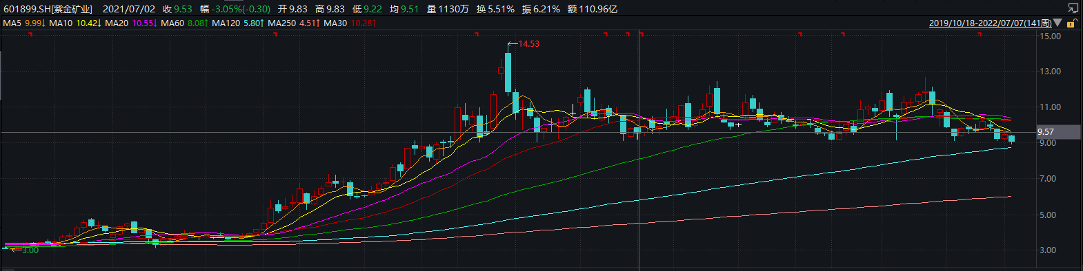 之后高毅晓峰鸿远基金还一路增持。到2021年四季度,其持有紫金矿业2.9亿股,虽然在今年一季度减持了2220万股,但截至一季度末还持有2.68亿股。而紫金矿业股价在二季度下跌了16.52%,期末收盘价9.33元。进入三季度,该股继续下跌,截至7月7日收盘,该股报收9.04元。