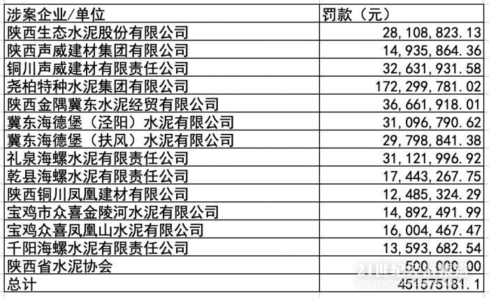 陕西省市场监督管理局对涉案企业处以2018年销售额2%-3%不等的罚款,多家企业被罚金额在1000万元-4000万元之间,尧柏特种水泥被罚金额达到1.72亿元,成为当中金额最大的一笔罚款。