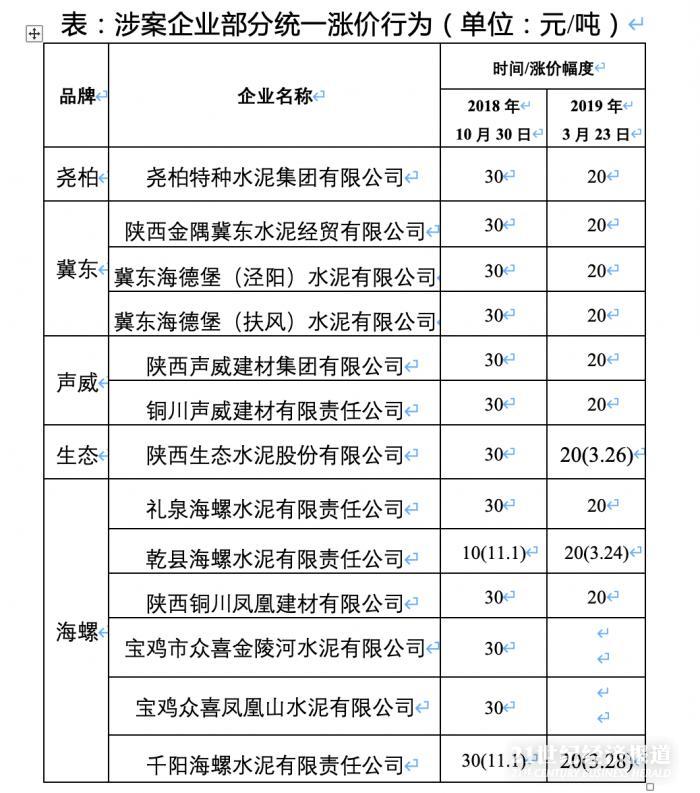 据陕西省市场监督管理局发布的消息,陕西省水泥协会共组织13家当地水泥企业达成并实施垄断协议,13家企业分别为:尧柏特种水泥集团有限公司、陕西金隅冀东水泥经贸有限公司、冀东海德堡(泾阳)水泥有限公司、冀东海德堡(扶风)水泥有限公司、陕西声威建材集团有限公司、铜川声威建材有限责任公司、陕西生态水泥股份有限公司、礼泉海螺水泥有限责任公司、乾县海螺水泥有限责任公司、陕西铜川凤凰建材有限公司、宝鸡市众喜金陵河水泥有限公司、宝鸡众喜凤凰山水泥有限公司和千阳海螺水泥有限责任公司。