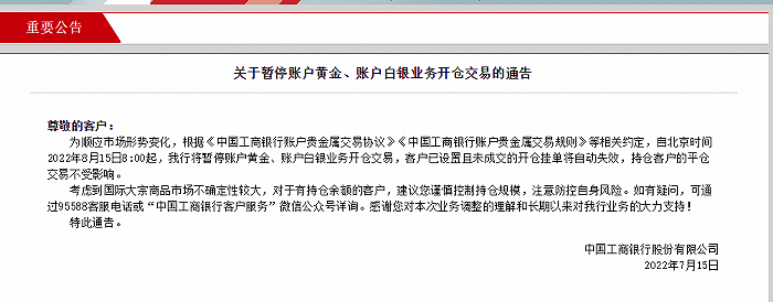 工商银行7月15日公告,自北京时间8月15日8:00起,我行将暂停账户黄金、账户白银业务开仓交易,客户已设置且未成交的开仓挂单将自动失效,持仓客户的平仓交易不受影响。