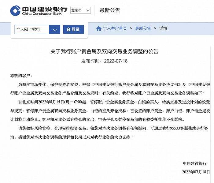 7月18日,中国建设银行官网发布公告称,自北京时间2022年8月15日(周一)7:00起,暂停账户贵金属业务黄金、白银的买入、转换交易及定投计划的设置与变更;暂停账户贵金属双向交易业务黄金、白银的空头开仓交易;已设置的账户黄金、账户白银、账户铂金定投计划将自动终止。客户相应业务原有持仓的卖出、空头平仓及暂停交易前的有效委托挂单不受影响。