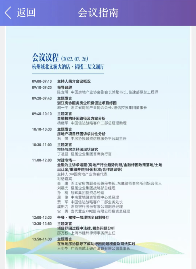 根据记者收到的最终版邀请函内容,中国房地产业协会副会长兼秘书长陈宜明致辞,浙江省房协会长胡一平做主题发言,“浙江房协服务房企积极促进项目纾困”;中国信达战略客户二部总经理助理杨继军发表“金融机构纾困路径及方案分析”;中房协投融资信息服务平台副主任石赟发表“房地产项目纾困诉求共性分析”……