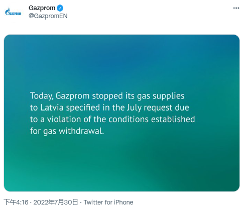 当地时间周六,俄罗斯天然气工业股份公司(Gazprom)发布公告称已经停止向邻国拉脱维亚供应7月合同框架的天然气,理由是后者违反了合同。