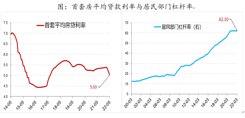 从领先的流动性指标来看,目前商品房价格与销量下行周期可能并未结束。我们认为当前房价下行可能并未结束,原因包括:一是当前房贷利率依然较高,限制居民购房能力与意愿。当前个人首套房平均房贷利率约5.03%,依然高于2016年中旬平均4.4%的水平。二是当前居民部门杠杆率高,加杠杆买房空间有限。当前居民部门杠杆率高达62%,2015年以来杠杆率接近翻倍,在2016~2019年的房价上涨中,居民提前透支了未来消费。三是居民加杠杆意愿下降。