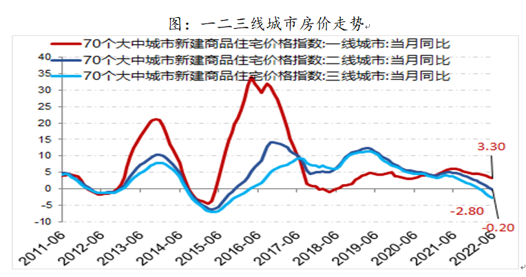 中国房地产市场正处于2015年以来最糟糕的下行周期。房价表现上,2021年下半年来房价持续走低,二三线城市房价同比已经负增长。6月三线城市房价同比-2.8%,二线城市房价同比-0.2%,一线城市房价同比3.3%,连续12个月下行。商品房销售上,6月中国商品房销售面积1.8亿平方米,同比-18%。