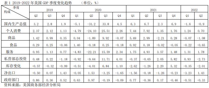 个人消费支出是美国经济增长的基石,消费疲软则意味着增长会陷入麻烦,经济衰退不再遥远。如表1,自2019年第二季度以来,除疫情最严重的2020年第一和第二季度外,2022年前两个季度的消费疲态尽显,第二季度增长仅0.7%,为2018年以来正常季度的最差值。自去年4月以来,通货膨胀持续升温,严重削弱了消费者的购买能力,第二季度个人商品消费增长跌1.08%,其中食品消费竟下降了0.65%。前不久,零售巨头沃尔玛和电商巨头亚马逊业绩拉响了红色警报,预期收入被下调,公司不得不采取措施降低库存水平。