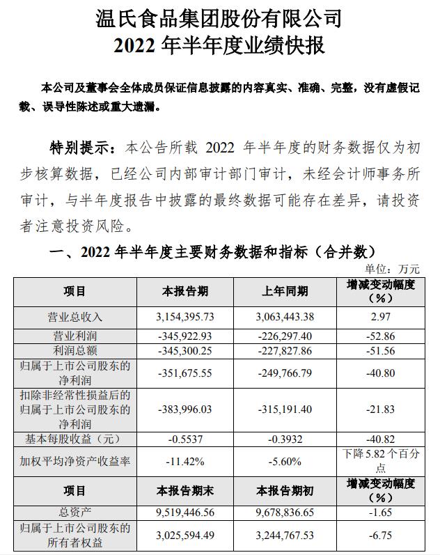 温氏股份(300498)8月4日披露业绩快报,上半年公司实现营业总收入为315.44亿元,净利润为亏损35.17亿元,上年同期亏损24.98亿元。报告期内,公司销售肉猪800.6万头,毛猪销售均价13.59元/公斤,同比下降41.74%,公司养猪业仍然处于较大亏损状态。