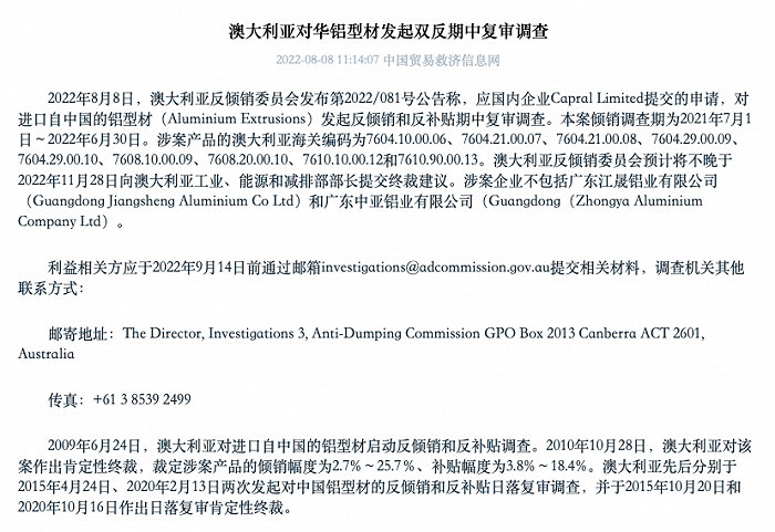 据中国贸易救济信息网,8月8日,澳大利亚反倾销委员会发布第2022/081号公告称,应国内企业Capral Limited提交的申请,对进口自中国的铝型材发起反倾销和反补贴期中复审调查。本案倾销调查期为2021年7月1日-2022年6月30日。澳大利亚反倾销委员会预计将不晚于2022年11月28日向澳大利亚工业、能源和减排部部长提交终裁建议。
