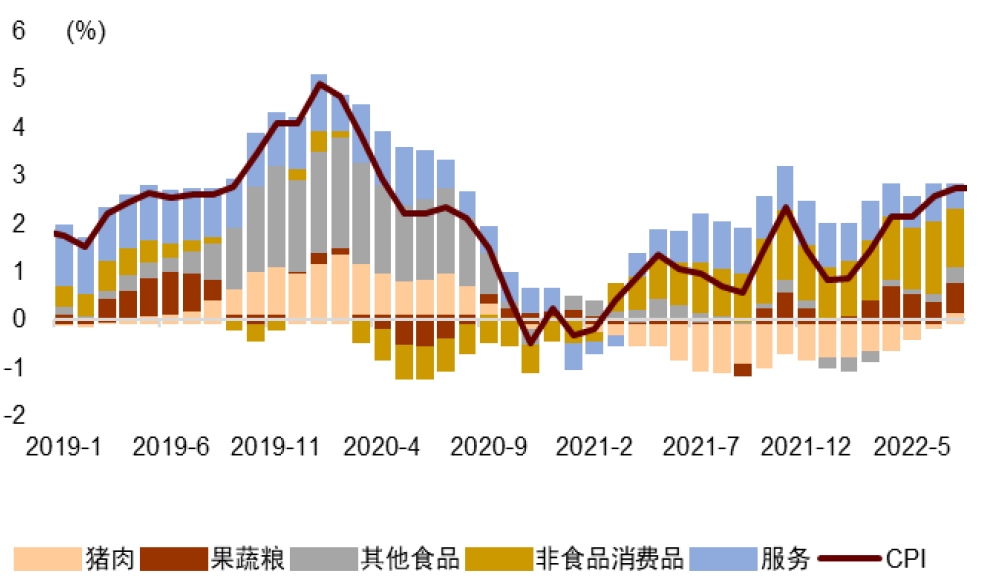受猪肉和鲜菜抬升,7月CPI同比如期上行(从2.5%上升至2.7%),但并未如市场预期突破3%,升幅低于预期主要是由于原材料和疫情对非食品的拖累较大。