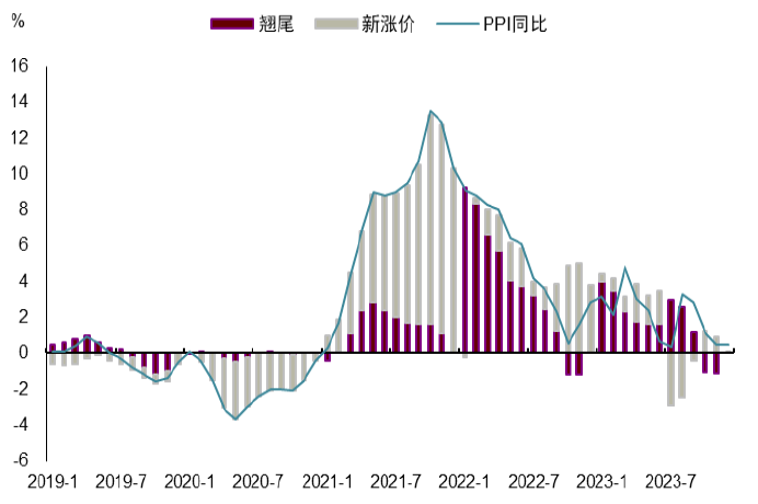 图表6:PPI同比新涨价因素拖累多,翘尾拖累少